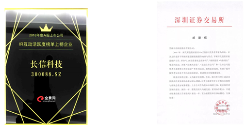 于此同时,公司也获得深圳证券交易所投资者中心的表彰,并以感谢信的形式表彰企业在2018年度投资者保护方面、提升投资者知识水平和风险防范意识方面、及作为资本市场主体促进资本市场健康方面的自我担当所做出的努力和贡献。